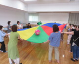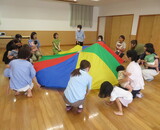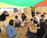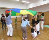 親子8組の参加があり、みんなで歌を歌ったり、パラバルーンで遊びました。