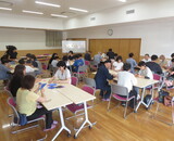 これは古江小学校の児童が、修学旅行で広島に持っていく千羽鶴を地域の人と一緒に折りながら世界平和を祈るという企画