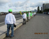 城北地区の方は、城東地区などと一緒に、7時25分に袖師町のとるぱ駐車場に集合し、30分からの開始式に参加して活動開始です。とるぱ駐車場に集合した方々は、国道9号線を挟んで二手に分かれ、東側の人は松江から出雲方面に向かう車に対してプラカードを掲げて交通安全運動し、西側の人はその反対方向に向かう車に対して同様な方法で行いました。